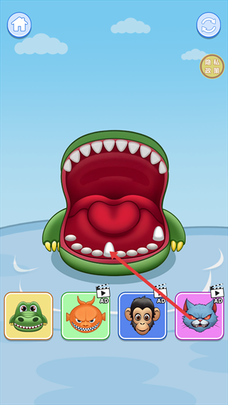 3、在鳄鱼互动游戏中,继续点击牙齿,完成该环节的互动操作。
