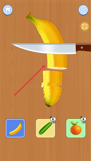 4、选择“香蕉”选项,操作刀具对香蕉执行切割动作,完成对应互动步骤。