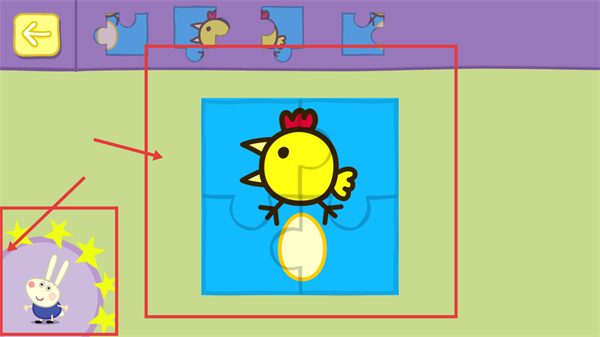 4、完成拼图后,界面呈现完整的小鸡图案,同时触发左侧的星星奖励提示,可继续进行后续的游戏互动或关卡挑战。