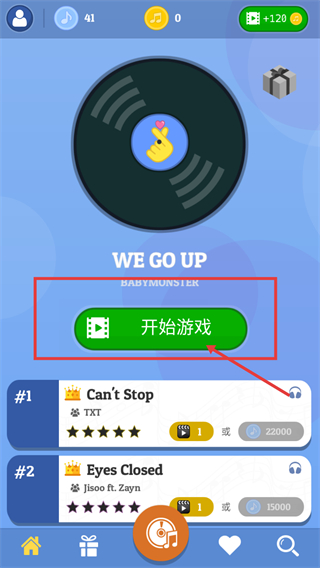 1、定位【WE-GO-UP】对应的【BABYMONSTER】曲目,点击红框标注的【开始游戏】按钮,即可进入该曲目的节奏游戏准备环节。
