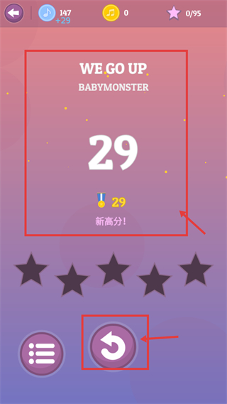 4、游戏结束后看到【WE-GO-UP】的得分【29】及【新高!】提示,点击红框内的重玩按钮,重新挑战该曲目提升成绩。