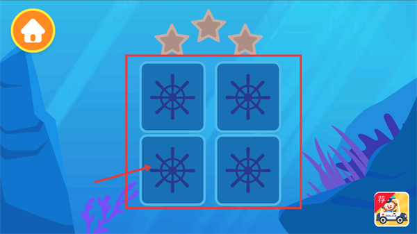 2、面对含【船舵】图案的四格方块,这是认动物关卡的初始界面,点击方块可触发后续动物图案显示,以此积累上方的星星进度。