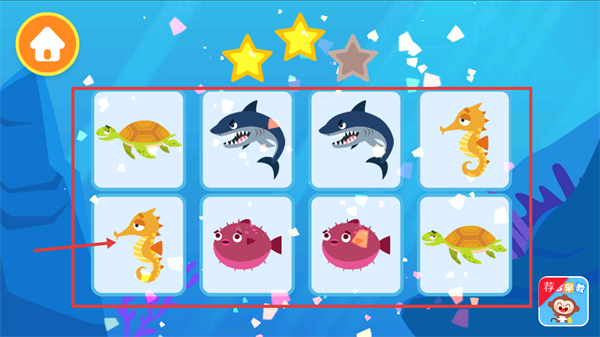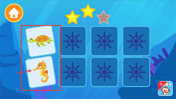 3、方块中出现【乌龟】-【海马】等海洋动物图案,需点击相同动物完成匹配,当前已点亮两颗【星星】,推进认动物的关卡进程。