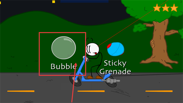 2、出现【Bubble】-【Sticky-Grenade】两类道具,当前选中【Bubble】,借助该道具可规避干扰,配合滑板车推进获取钻石的流程。