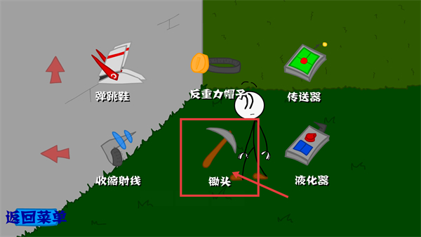 1、看到可选道具含【弹跳鞋】-【反重力帽子】-【传送器】-【收缩射线】-【锄头】-【液化器】,当前选中【锄头】,助力后续潜入操作。