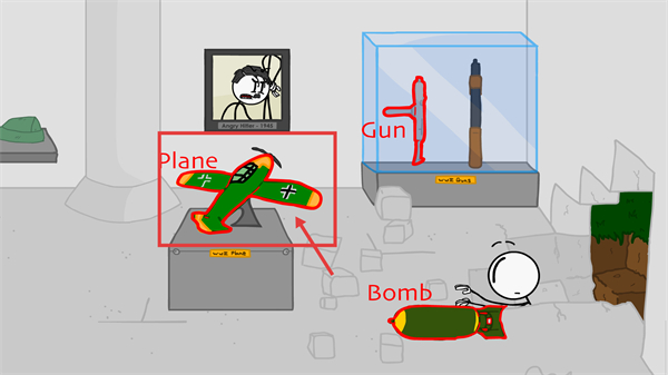 2、场景中出现可互动物品【Plane】-【Gun】-【Bomb】,分布在展台与地面,需依潜入需求选对应物品,推进钻石盗取流程。