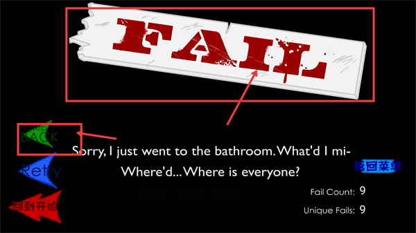 4、出现【FAIL】提示,搭配【BACK】-【Retry】选项,当前【Fail-Count-9】-【Unique-Fails-9】,可选【Retry】重新闯关。