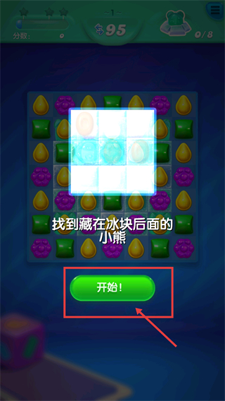 1、界面显示目标【找到藏在冰块后面的小熊】,点击【开始!】按钮开启关卡,初始分数为【95】,需消除元素解锁冰块后的内容。