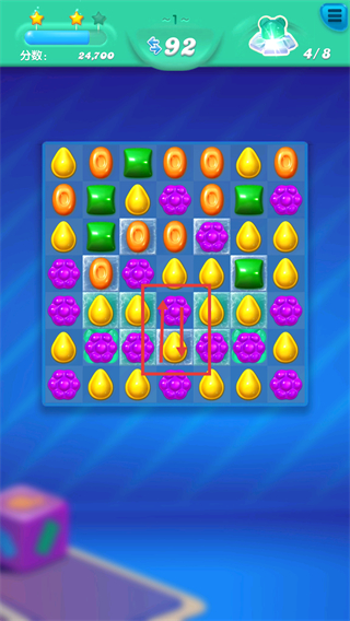 2、消除对应区域的糖果元素,分数升至【24700】,同时推进收集进度至【4/8】,持续消除可提升分数与进度。