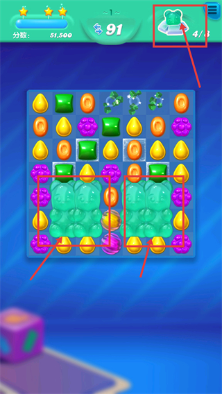 3、分数提升至【51500】,消除标注区域的元素解锁冰块,推进右上角【4/8】的收集进度,助力完成关卡目标。