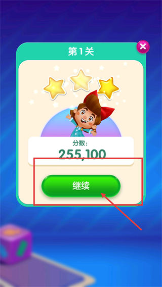 4、【第1关】通关获得三星评价,分数达【255100】,点击【继续】按钮可进入后续关卡,推进游戏流程。