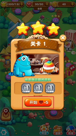 1、进入【关卡1】界面,目标是【收集做蛋糕的原料】,点击【开始】按钮,消耗5爱心开启该关卡的原料收集挑战。
