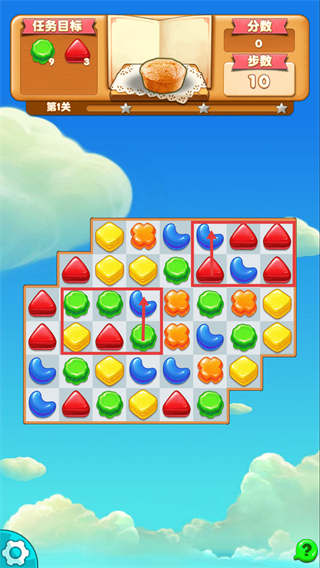 2、处于【第1关】界面,任务目标是收集【绿色马卡龙-9】和【红色马卡龙-3】,跟随箭头匹配相同方块,在【步数-10】内推进进度。