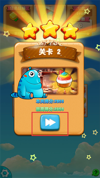 4、通关【关卡2】后获得三星评价,本关得分【2950】,点击蓝色的前进按钮,即可进入后续的原料收集关卡。
