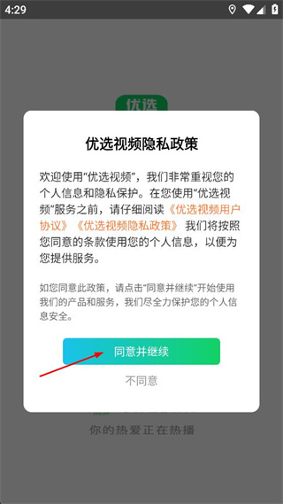 1、打开优选视频软件,看到优选视频隐私政策弹窗,点击同意并继续按钮,完成协议确认。