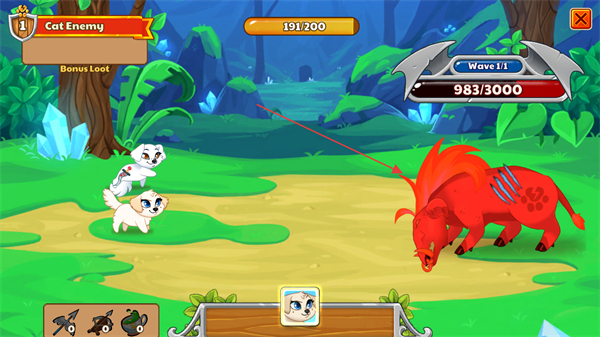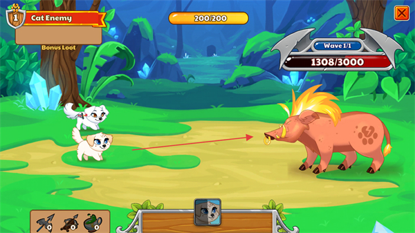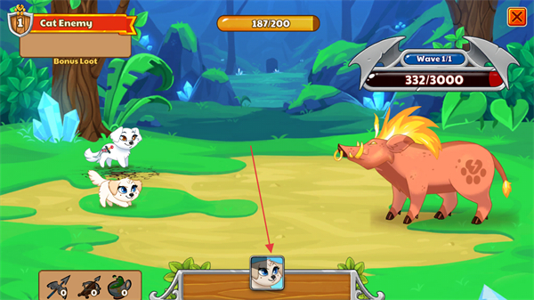 1、操控猫咪单位攻击敌方野猪,削减其血量,推进Wave1/1的战斗进程。