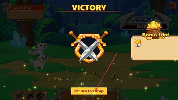 4、战斗胜利显示VICTORY,获得奖励,点击ReturntoCamp返回营地。