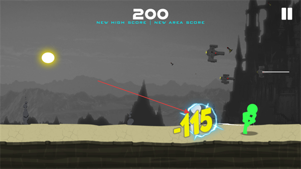 1、操控绿色火柴人攻击敌方单位,造成-115伤害,将分数提升至200,推进战斗进程。