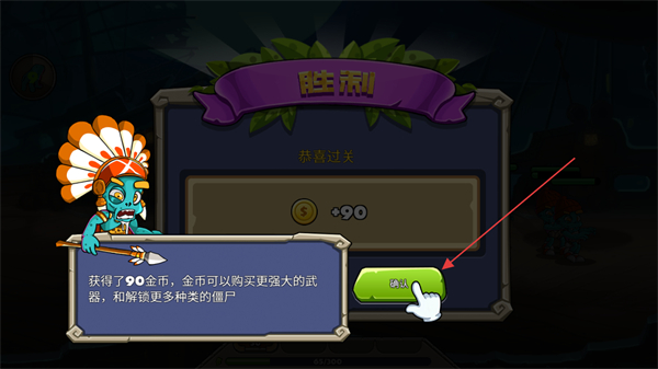 4、通关后获得金币奖励,点击确认结算,可用金币购买更强装备或解锁新僵尸。