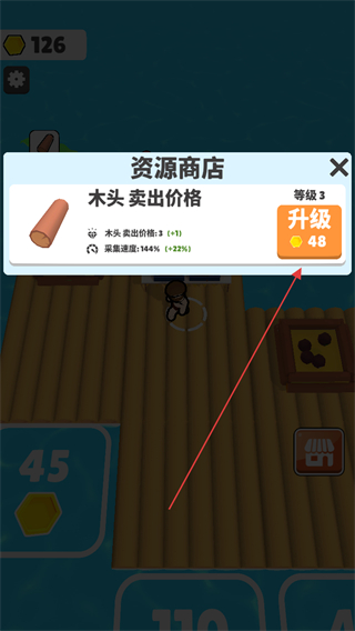 2、打开资源商店,消耗金币升级木头卖出价格如消耗48金币升级,提升后续售卖收益。