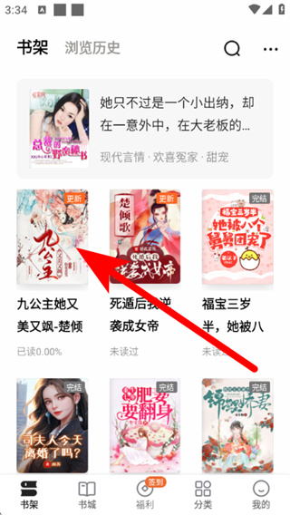 1、在免费小说阅读星书架页面,选择目标书籍,点击进入阅读界面。