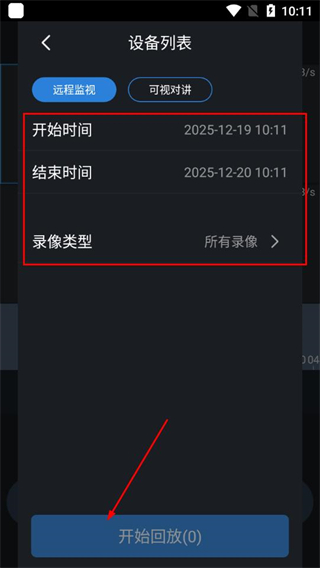 3、在设备列表中设置开始时间、结束时间和录像类型,点击开始回放即可查看对应录像。