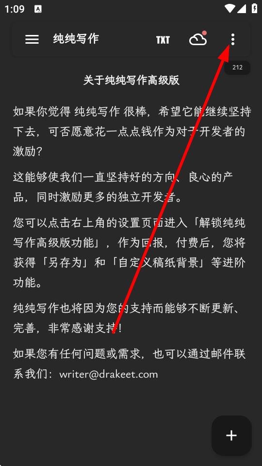 1、打开纯纯写作应用,点击界面右上角三点图标。
