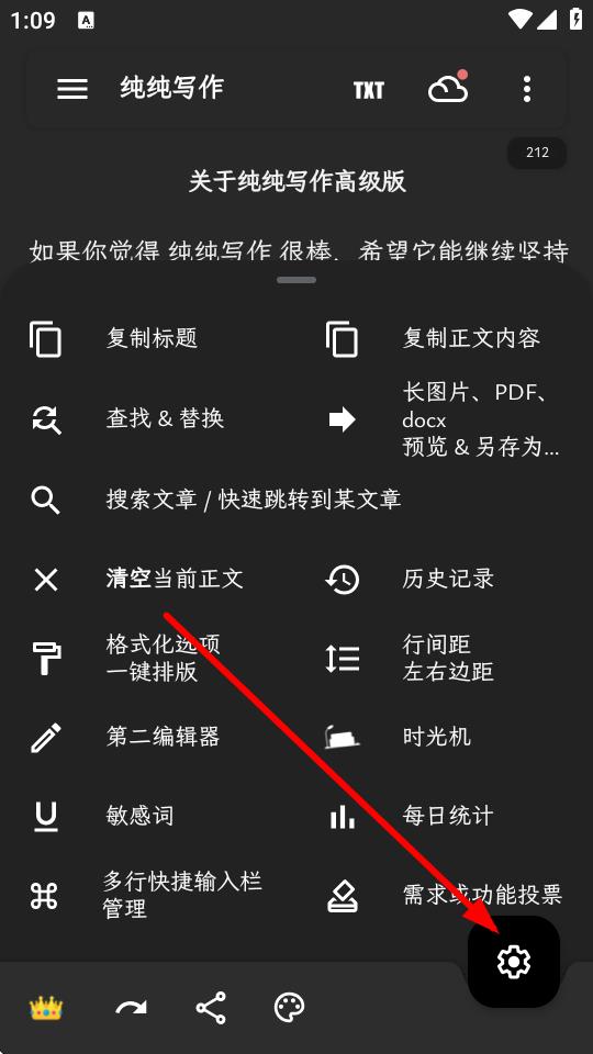 1、在纯纯写作功能菜单中,点击设置选项,进入设置页面。
