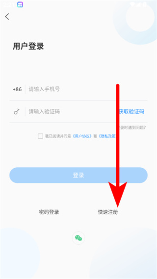 3、在用户登录页面,点击快速注册选项,进入用户注册页面。