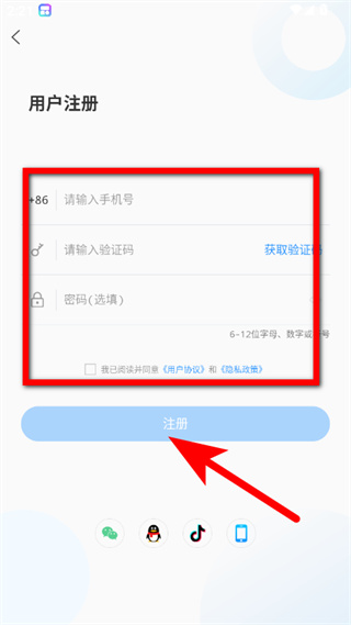 4、填写手机号、获取并输入验证码,勾选协议后点击注册,完成账号注册。