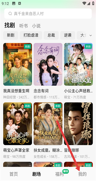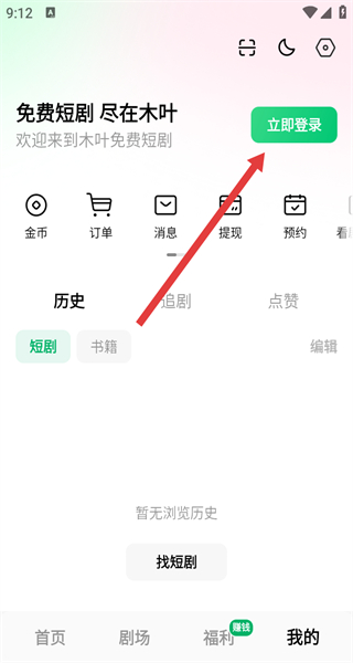 1、打开木叶免费短剧,在“剧场”页面点击底部导航栏的“我的”选项,进入个人中心界面。