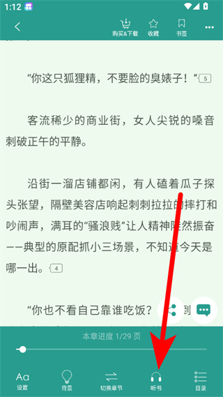 3、在阅读界面,点击下方听书选项,进入听书设置页面。