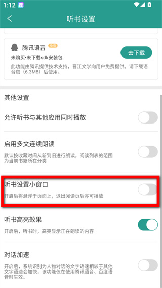 4、在听书设置页面,找到听书设置小窗口开关并打开即可。