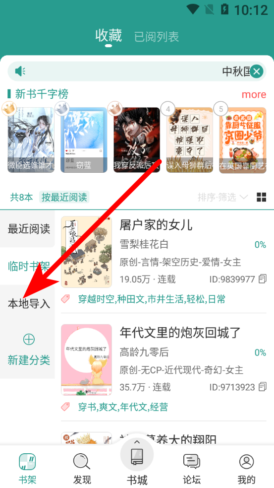 2、在书架界面,点击本地导入选项,进入本地导入页面。