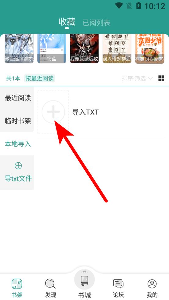 3、在本地导入页面,点击导入TXT的加号按钮,进入导入本地书籍界面。