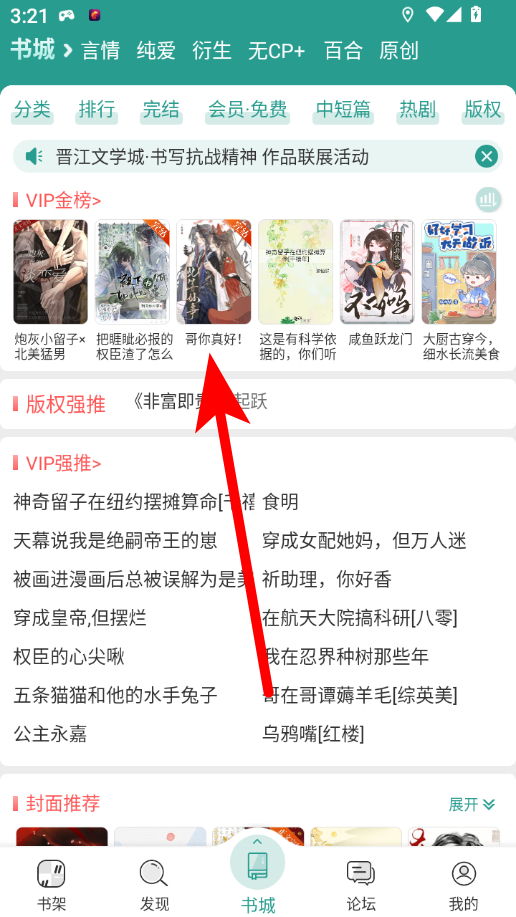 1、在晋江书城页面,选择目标书籍,点击进入详情页。