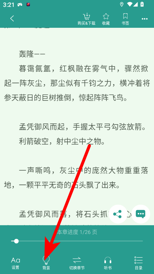 3、在小说阅读界面,点击屏幕,唤起底部功能栏,然后点击背景选项。