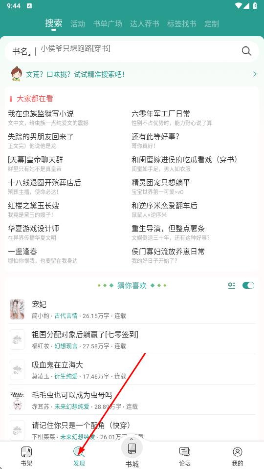 1、点击底部发现图标,进入页面后,可在搜索栏输入书名如小侯爷只想跑路[穿书]精准查找,或浏览大家都在看推荐列表如《我在虫族监狱写小说》。