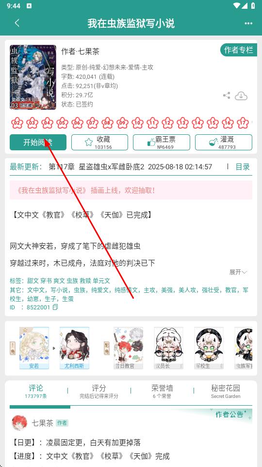 2、点击目标书籍,进入详情页,查看作者七果茶、作品类型原创·纯爱·幻想未来·爱情·主攻、等信息,了解最新更新章节第117章盗雄虫×雌蜂卧底2。