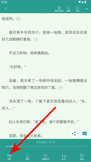 3、在小说阅读页面,点击左下角设置选项,展开设置菜单。