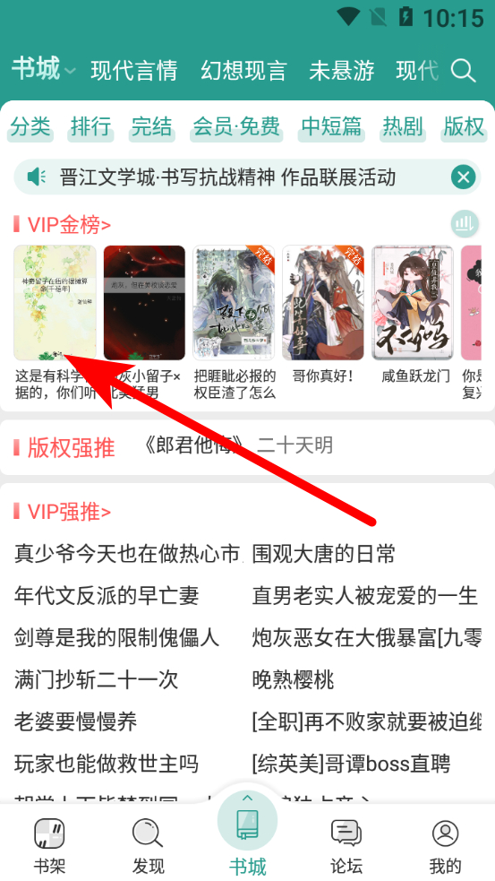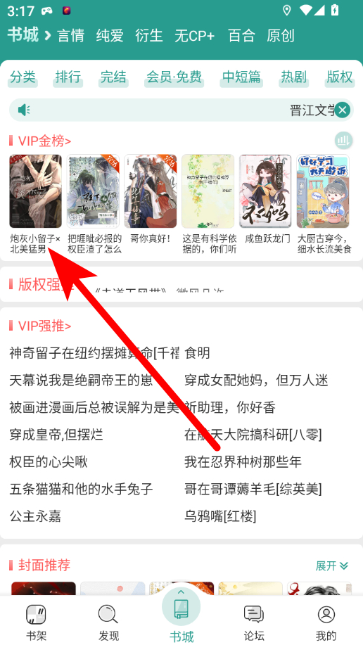 1、在晋江书城页面,选择目标书籍,点击进入详情页。