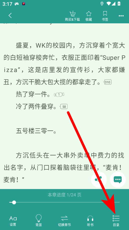 3、在小说阅读界面,点击屏幕,唤起功能栏,然后点击右下角目录选项。