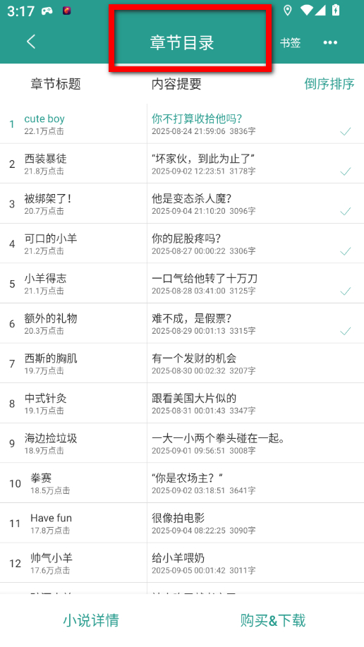 4、点击后,即可查看该小说的章节目录,能看到章节标题、内容提要等信息。