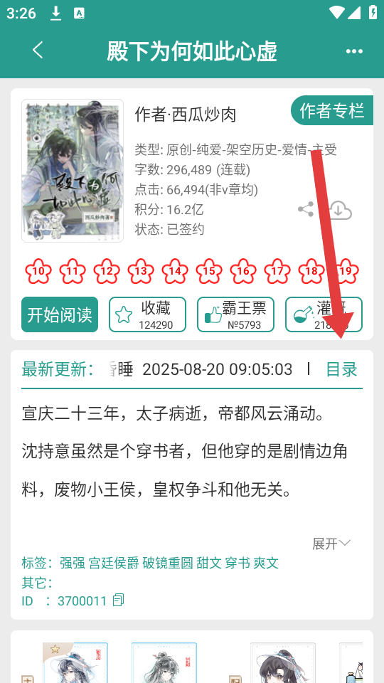 1、在晋江书城的界面,先找到想阅读的小说如示例中殿下为何如此心虚,点击进入小说的详情页面。
