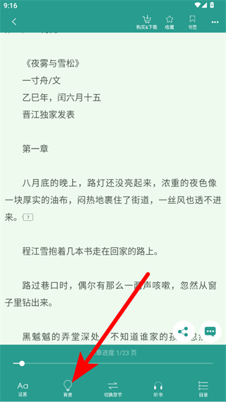 3、在小说阅读页面,点击下方背景选项,展开背景设置菜单。