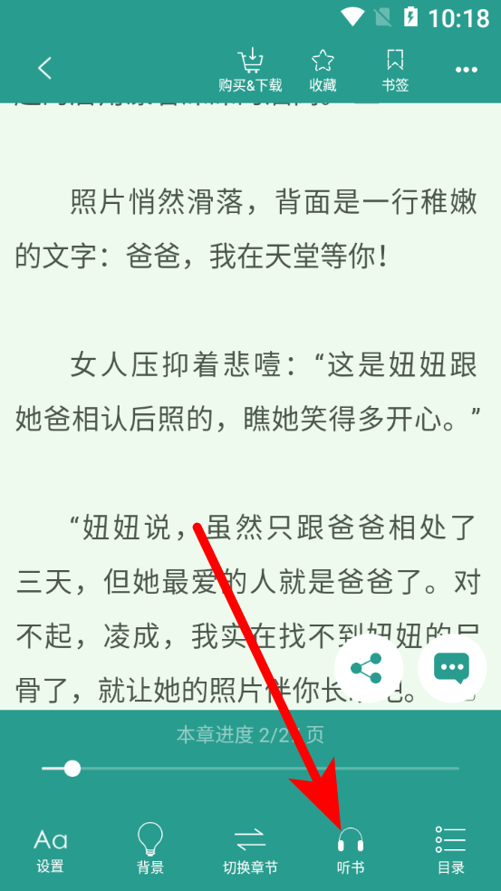 3、在小说阅读页面,点击下方听书选项,进入听书设置界面。