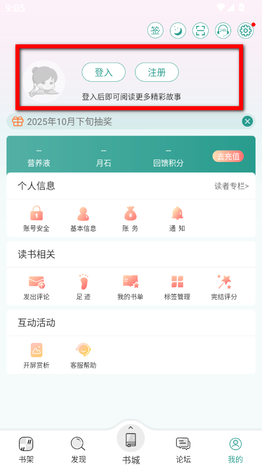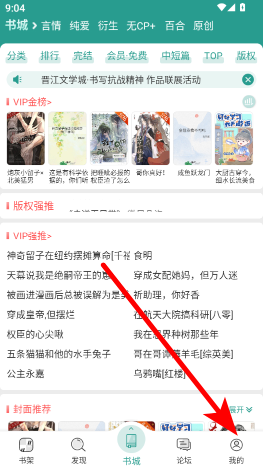 1、在晋江小说阅读书城页面,点击右下角我的选项,进入个人中心界面。