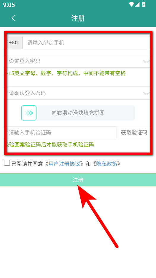 4、按要求填写手机、密码等信息后点击注册,即可完成账号注册操作。