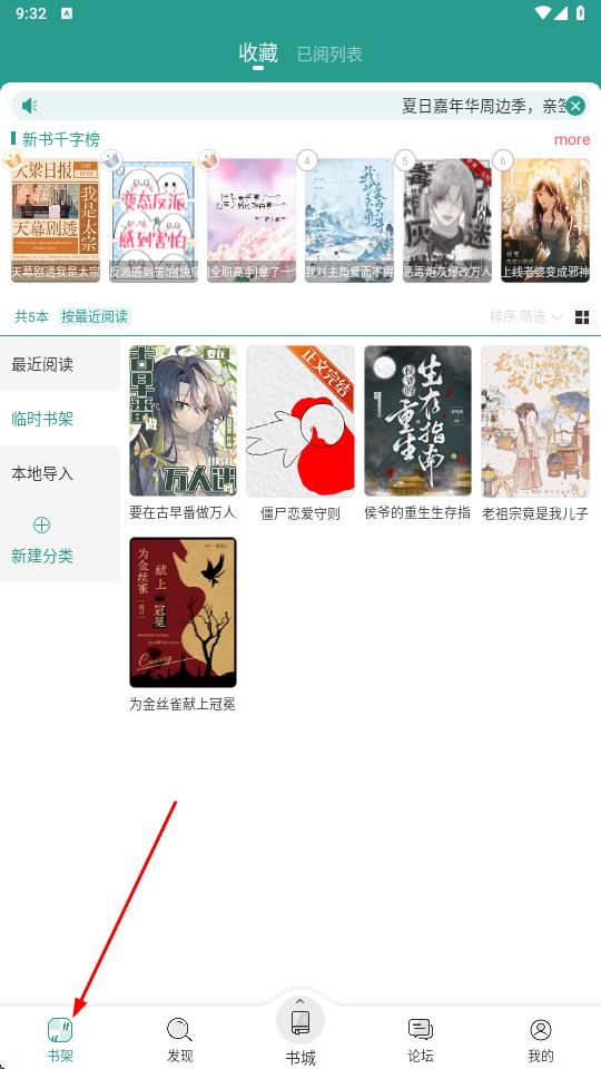 1、点击界面底部书架图标,进入收藏列表界面,在最近阅读区域定位《要在古早番做万人迷吗?》,点击书籍封面跳转至详情页。