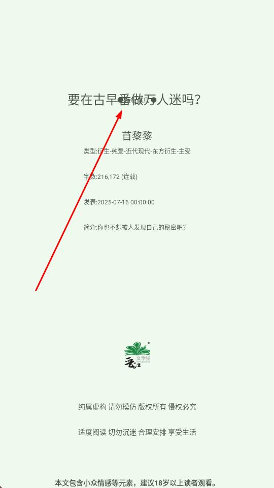 2、在详情页,查看作者苜黎黎、作品类型衍生·纯爱·近代现代·东方衍生·主受、同时留意页面底部纯属虚构请勿模仿”等版权声明与阅读提示。